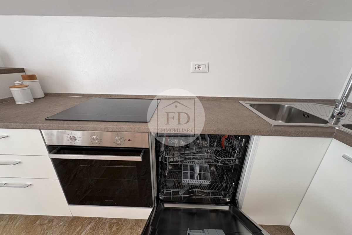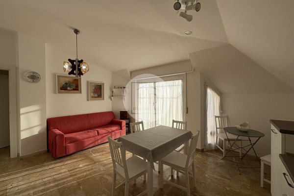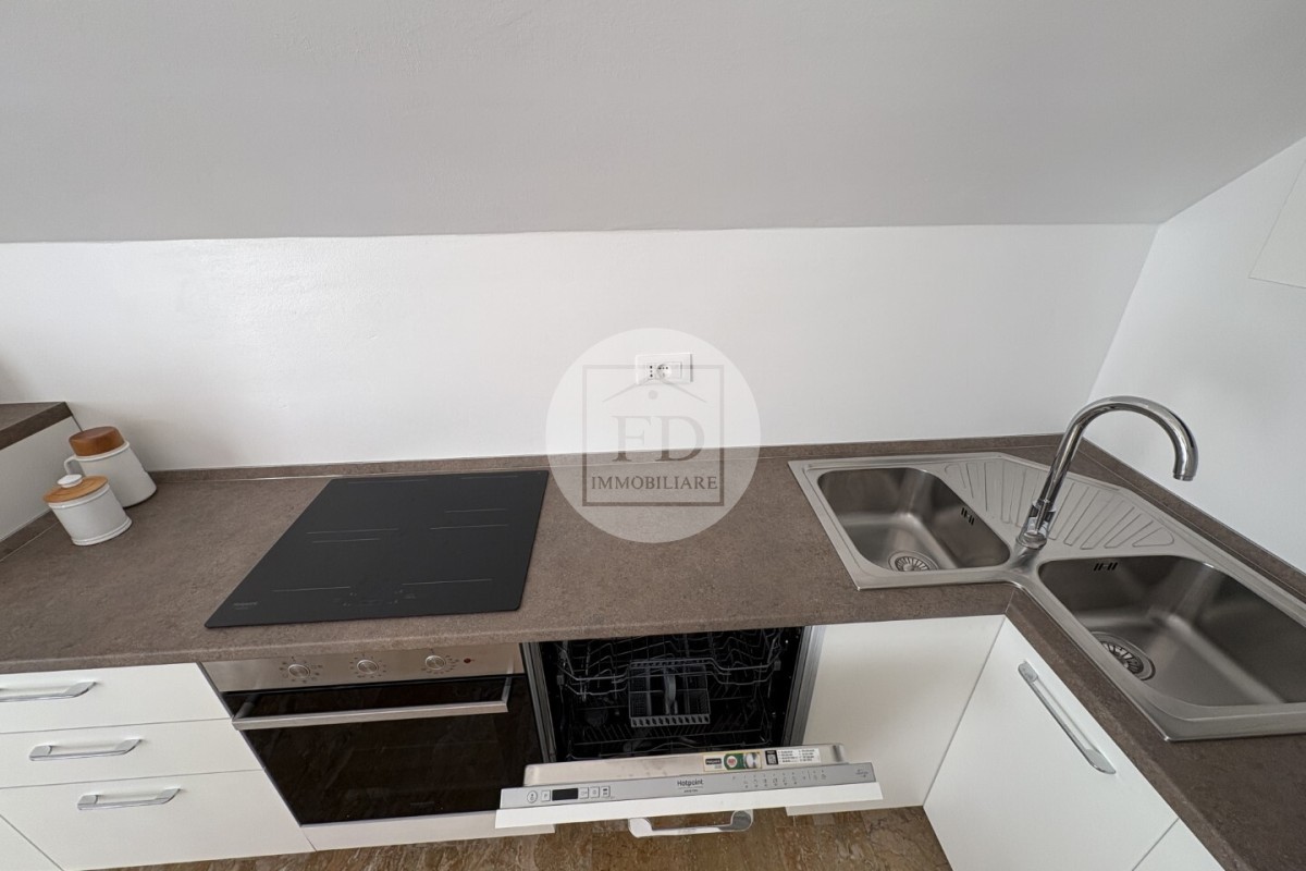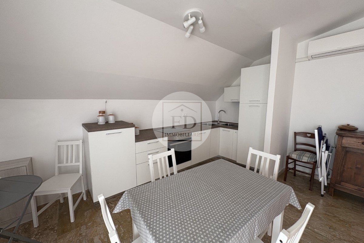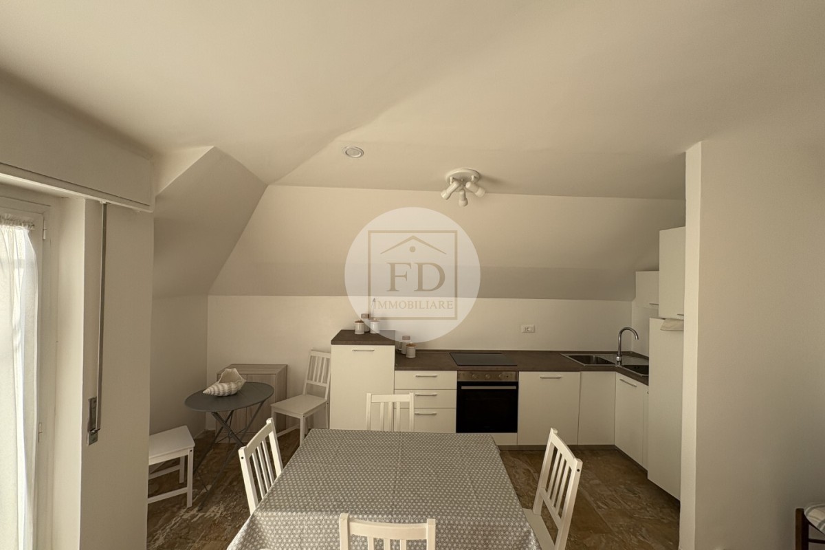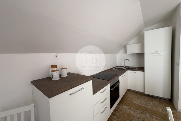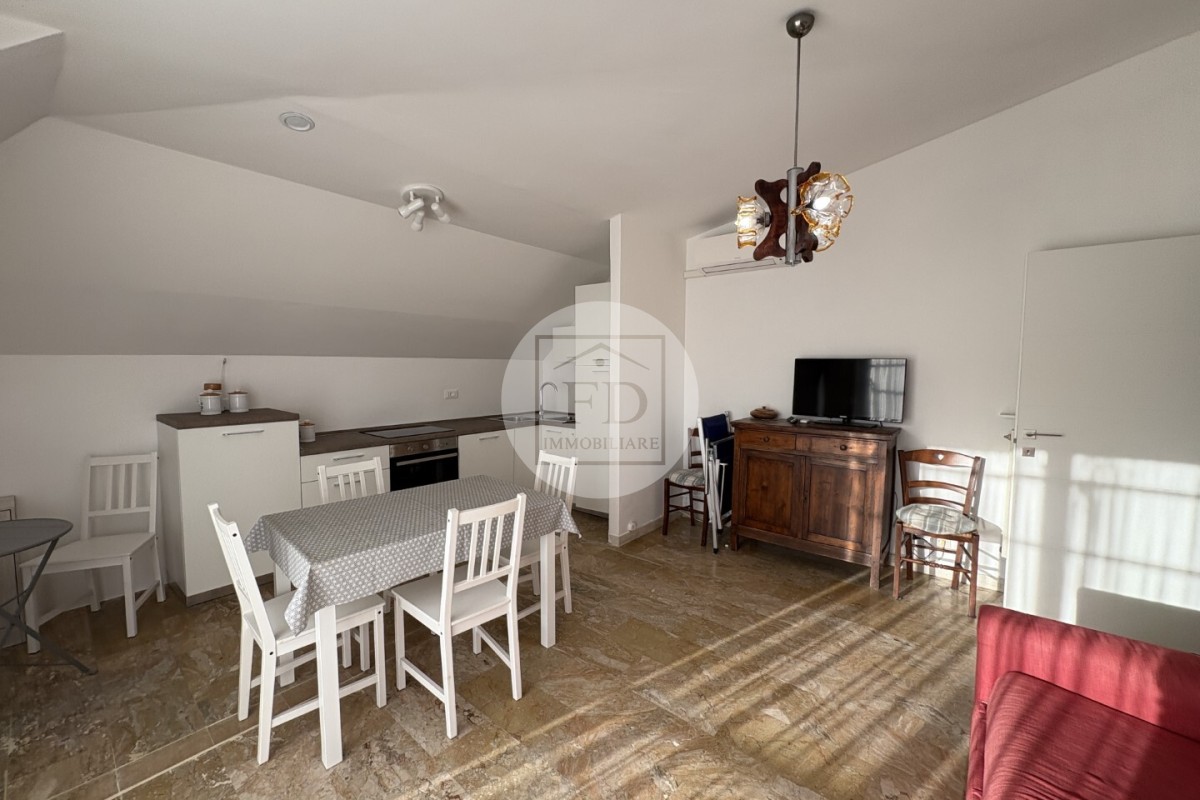 L'appartamento è mansardato (alto), con un soffitto spiovente che dona un tocco di charme all'ambiente.